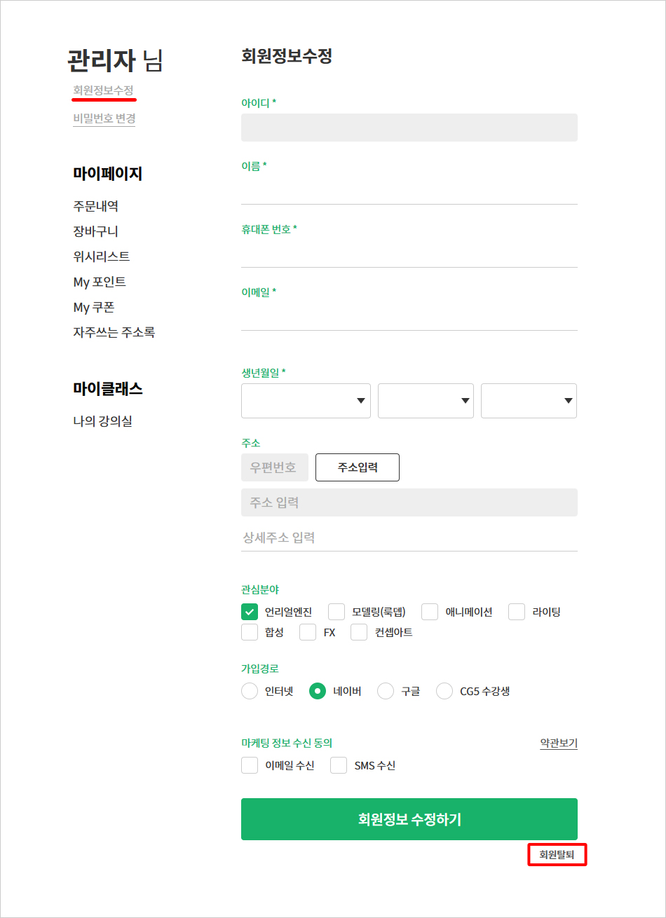 [마이페이지] > [회원정보 수정] 접속 후,
