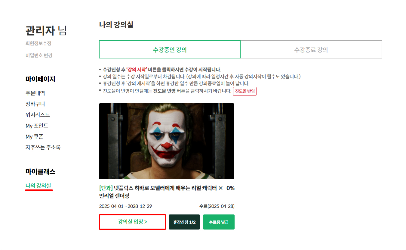 수강할 강의의 [강의실 입장] 버튼을 누르면 바로 학습을 시작할 수 있습니다.