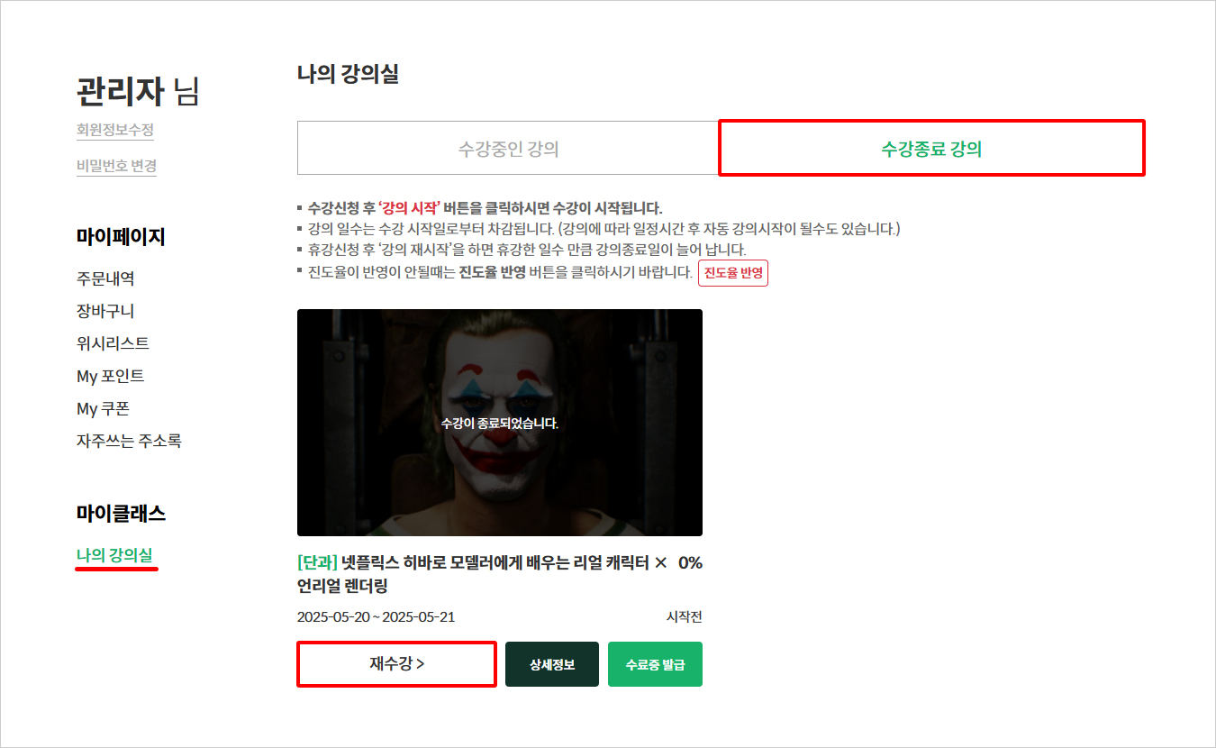 [마이클래스] > [나의 강의실]로 이동해주세요.